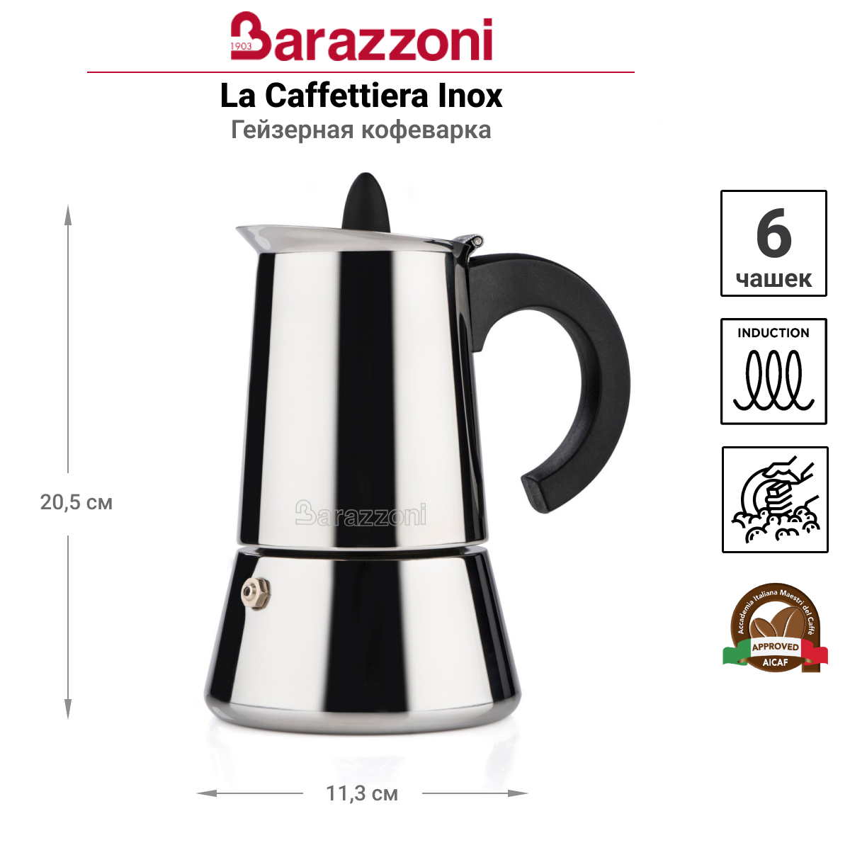 Купить Гейзерная кофеварка на 6 чашек Barazzoni La Caffettiera Inox, 20.5 см, нержавеющая сталь 18/10, бакелит, цвет серебристый (830008006)