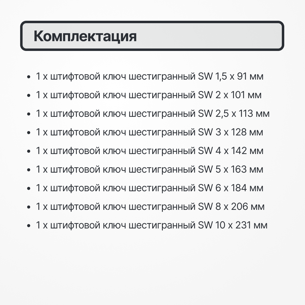 | Ключи имбусовые подробно | HEX1,5 х 91 мм, HEX2 х 101 мм, HEX2,5 х 113 мм, HEX3 х 128 мм, HEX4 х 142 мм, HEX5 х 163 мм, HEX6 х 184 мм, HEX8 х 206 мм, HEX10 х 231 мм |