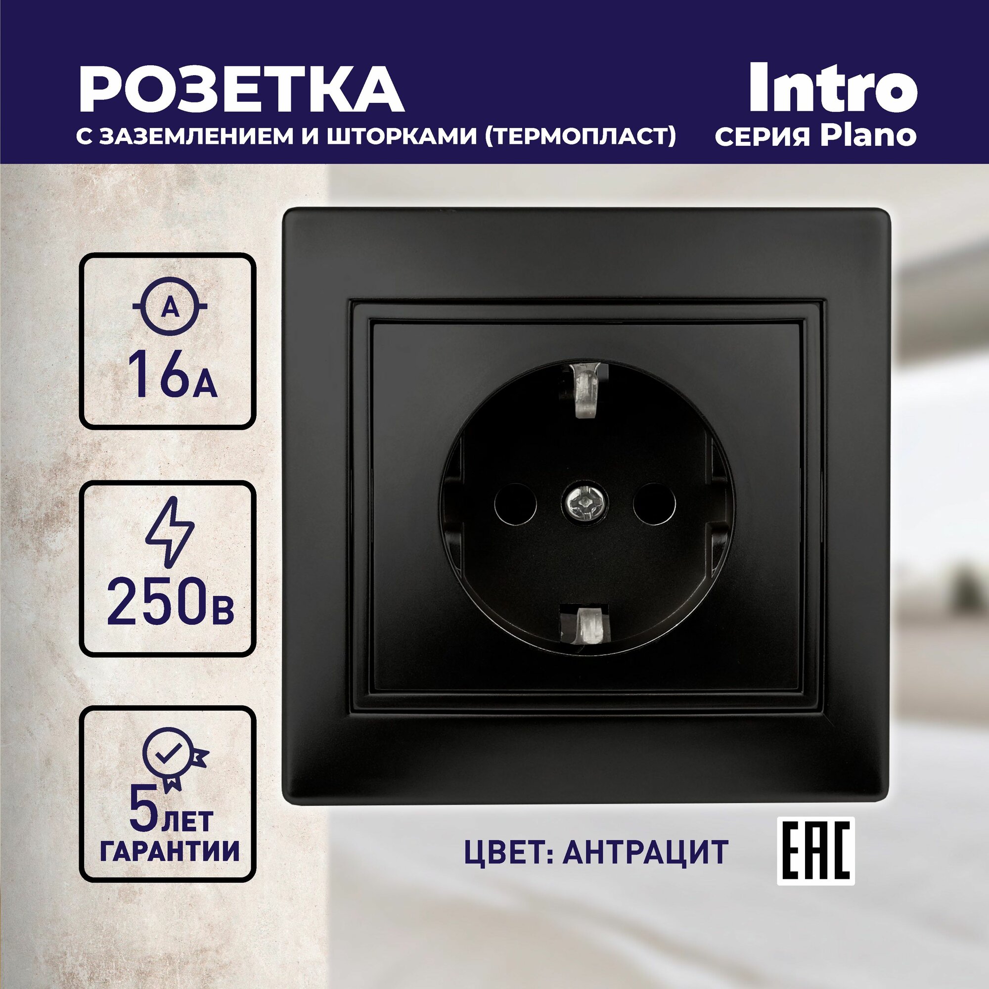 Купить Розетка Intro Plano 1-206-05 с заземлением 2P+E Schuko со шторками 16А-250В IP20 скрытой установки черный