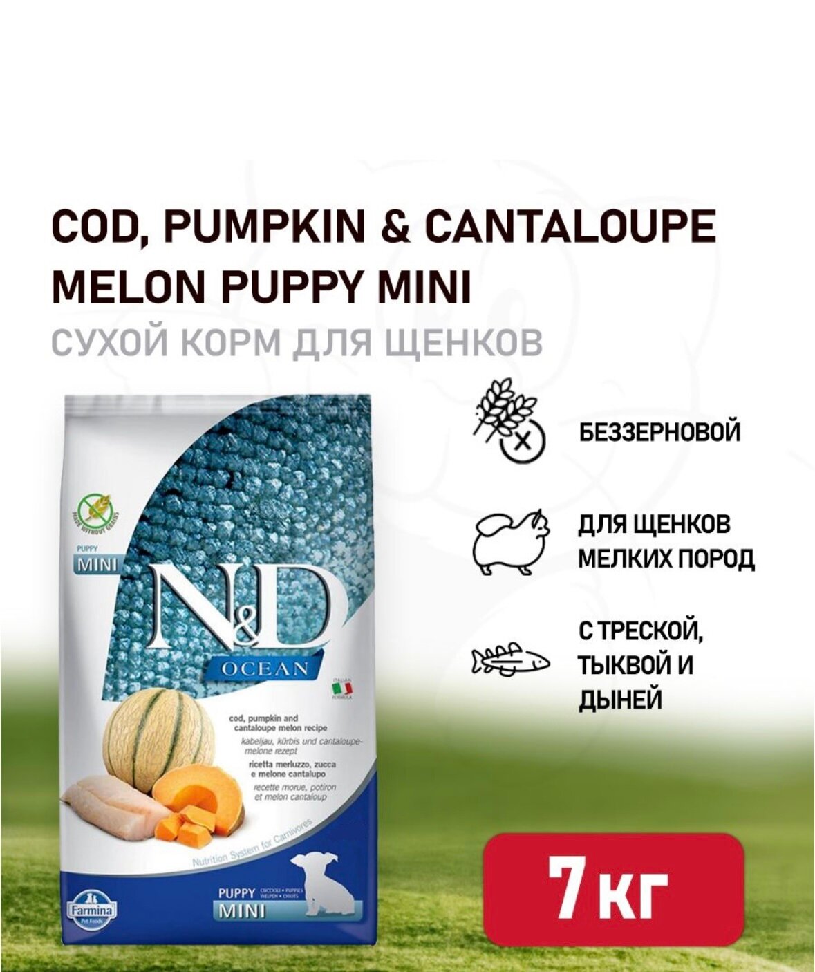 Сухой корм Farmina N&D Ocean Cod, Pumpkin&Cantaloupe Melon Puppi Mini, для щенков маленьких пород, беззерновой, треска, тыква и мускусная дыня, 7 кг
