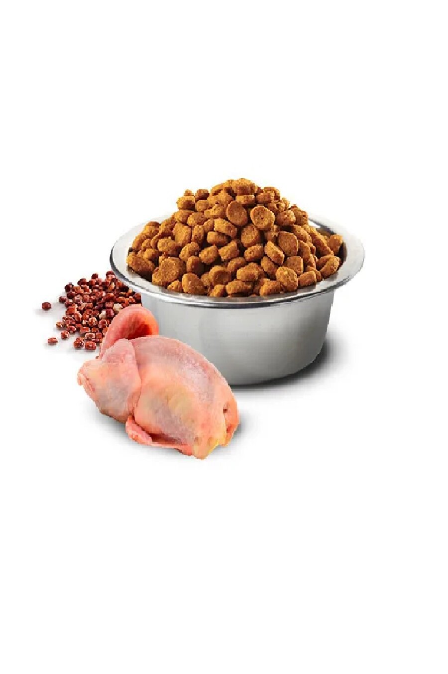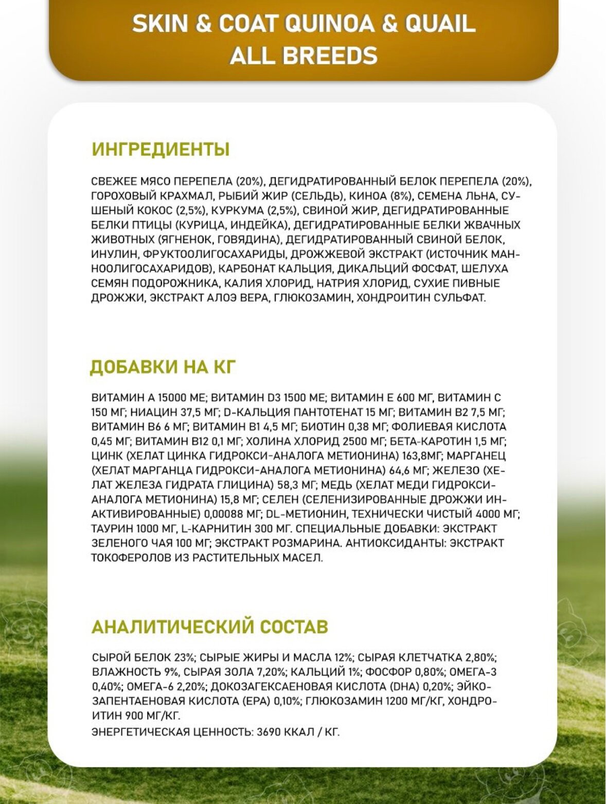 | Состав | свежее мясо перепела (18%), дегидратированное мясо перепела (18%), гороховый крахмал, рыбий жир, экстракт семян киноа семян (8%), льняное семя, сушеный кокос (2,5%), куркума (2,5%), инулин, фруктоолигосахариды, маннанолигосахариды (дрожжевой экстракт), карбонат кальция, моно-дикальций фосфат, подорожник, калия хлорид, натрия хлорид, сухие пивные дрожжи, глюкозамин, хондроитин сульфат, экстракт календулы |