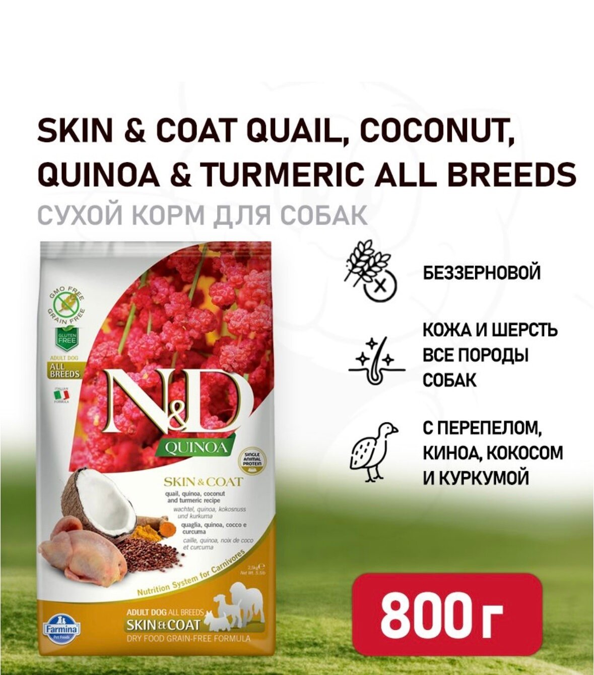 Сухой корм для собак Farmina N&D, беззерновой, для здоровья кожи и шерсти, перепелка, с киноа 800 г