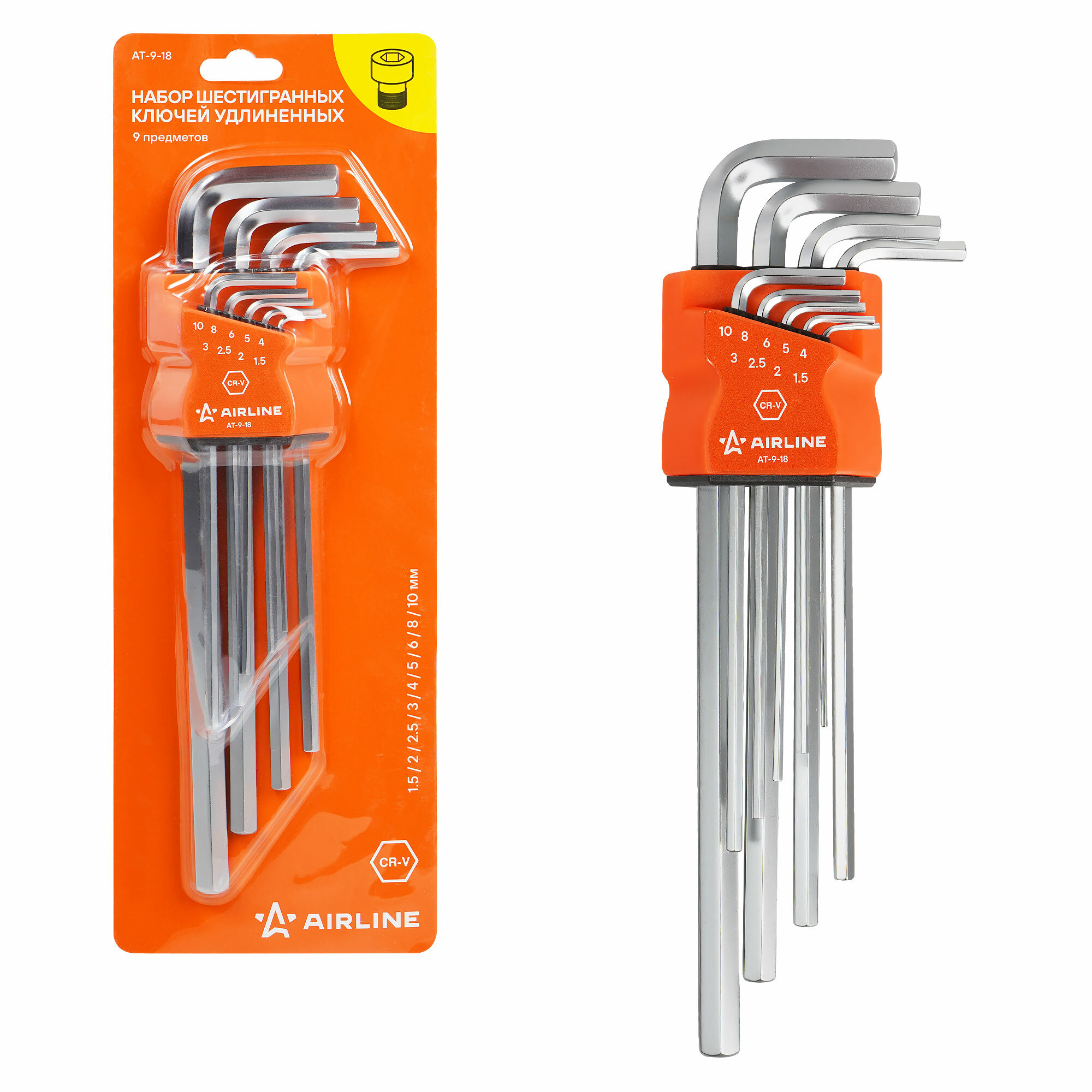Набор Шестигранных Ключей Удлинённых 9 Предметов 1.5,2,2.5,3,4,5,6,8,10Мм, Пласт.подвес AIRLINE арт. AT-9-18