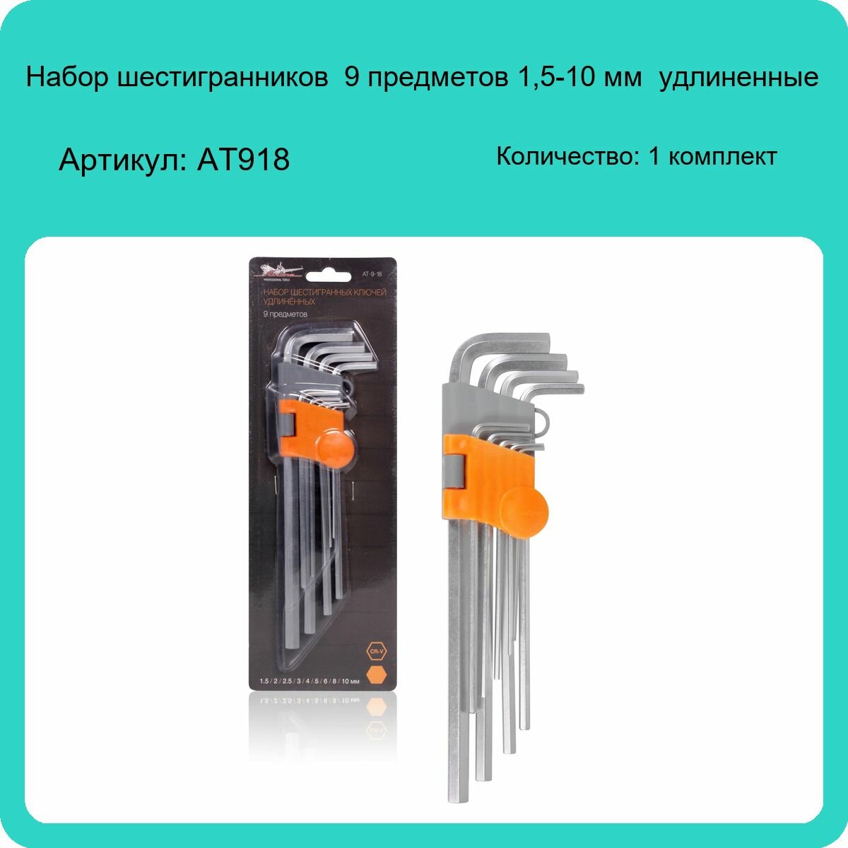 Набор шестигранных ключей удлинённых инбус 9 предметов (1.5,2,2.5,3,4,5,6,8,10мм) пласт.подвес (AT-9-18)