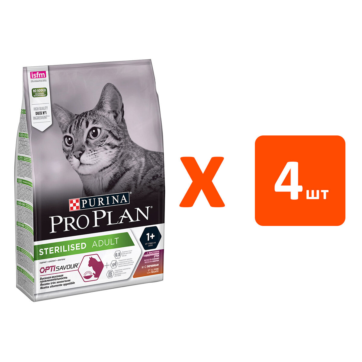 Сухой корм для стерилизованных кошек и кастрированных котов Purina Pro Plan Sterilised ADULT OPTISAVOUR, с уткой и с печенью, 4 шт. х 1.5 кг