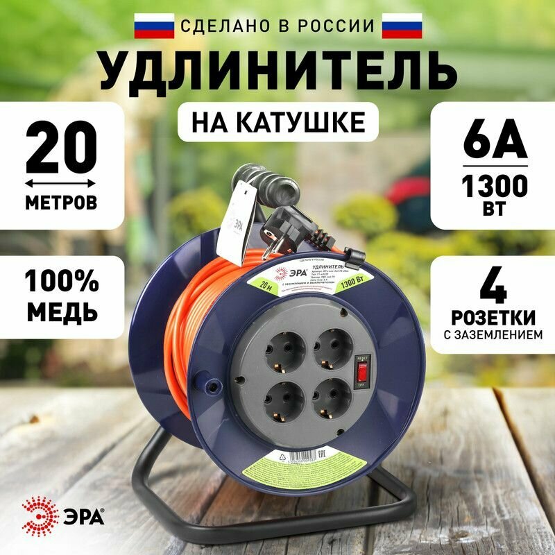 Удлинитель силовой Эра RPx-4es-3х0.75-20m, розеток 4шт, 3x0.75 кв.мм, 6A, 20м, ПВС, катушка, оранжевый [б0046845]