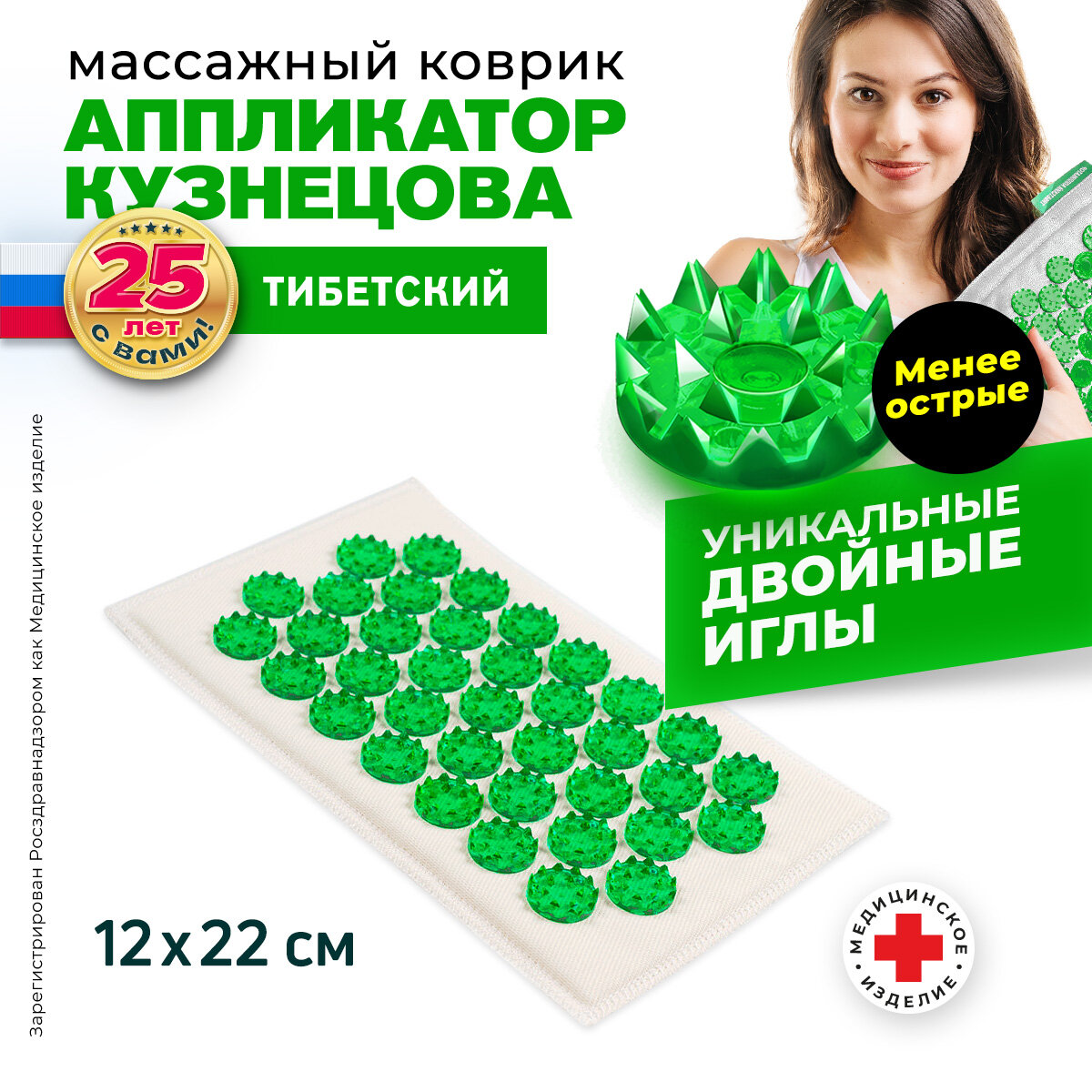 Аппликатор Кузнецова. Тибетский акупунктурный массажный коврик малый 12х22 см., на мягкой подложке 0,7 см., зеленый (менее острые иглы). Цвет ткани - "натуральный лён".