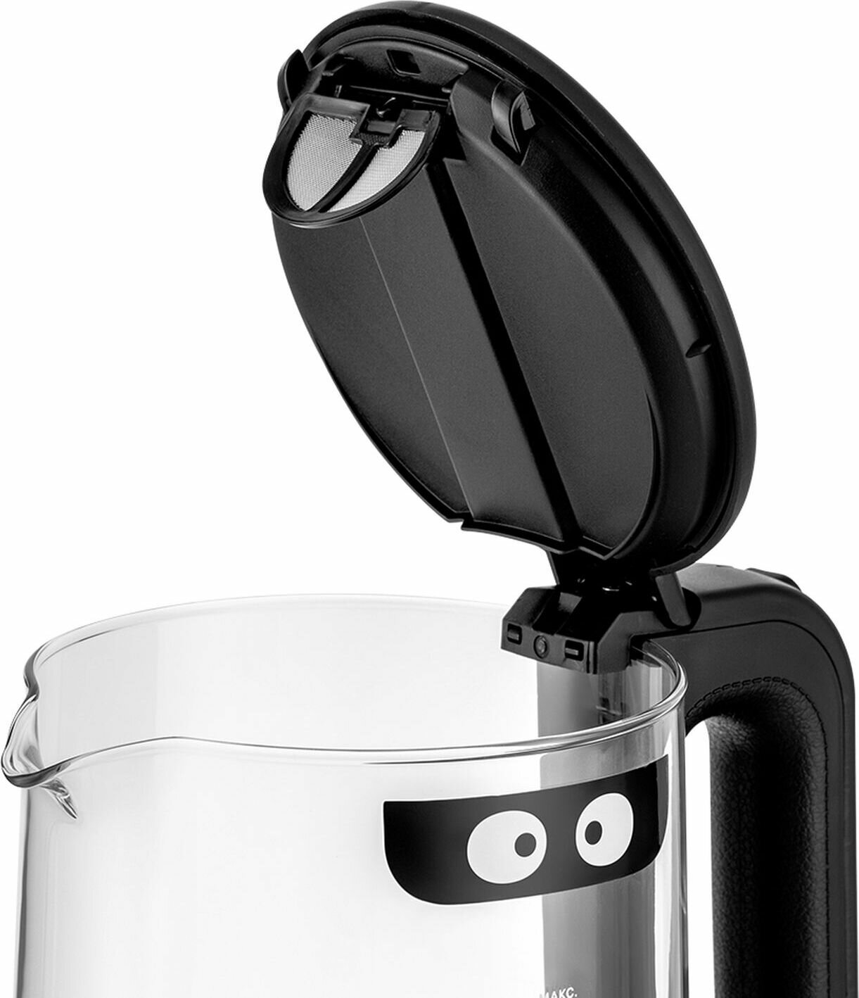 Чайник очень понравился, выполнен в строгой лаконичностей форме, без наворотов, наклейка с глазами легко отклеивается.