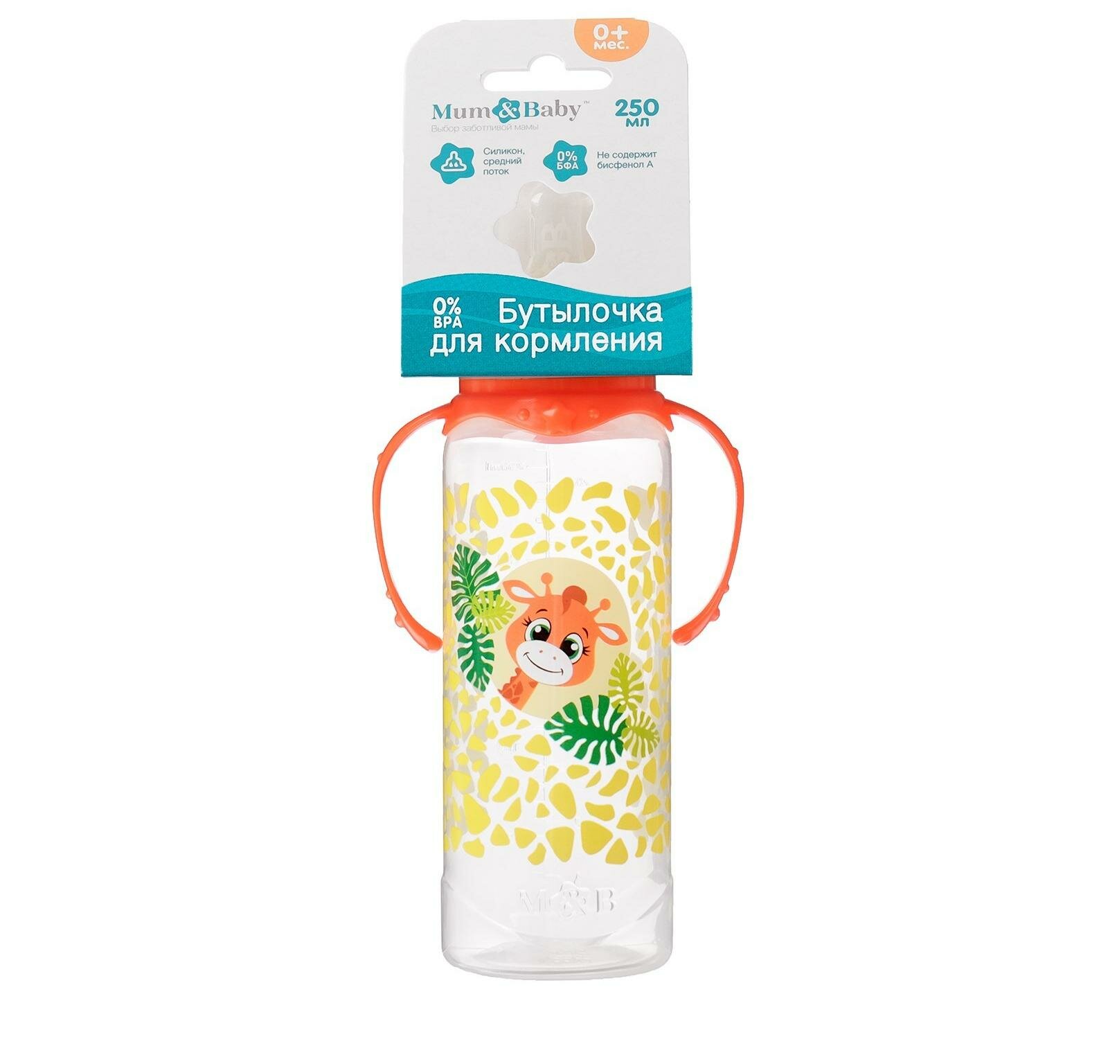 Бутылочка для кормления малыша M&B «Жирафик Лило», классическое горло, с ручками, от 0 мес., 250 мл., цвет оранжевый