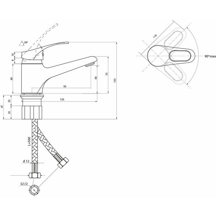 Смеситель для умывальника с литым изливом, однорычажный, хром, гибкая подводка 50см (Славен)