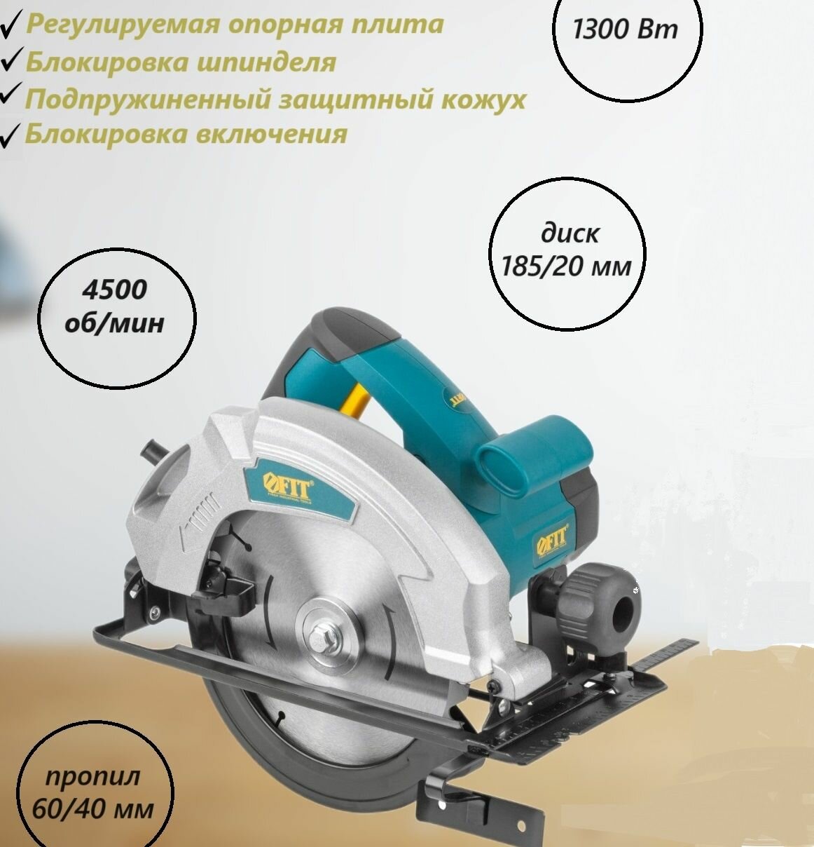 Пила дисковая 1300 Вт; 4500 об/мин; 185/20 мм; жел. опора; рез. накл.; блок шпинд.; коробка, FIT 80404 (1 шт.)