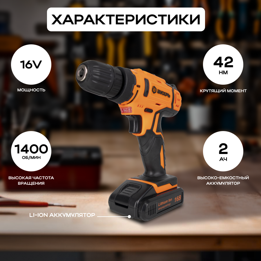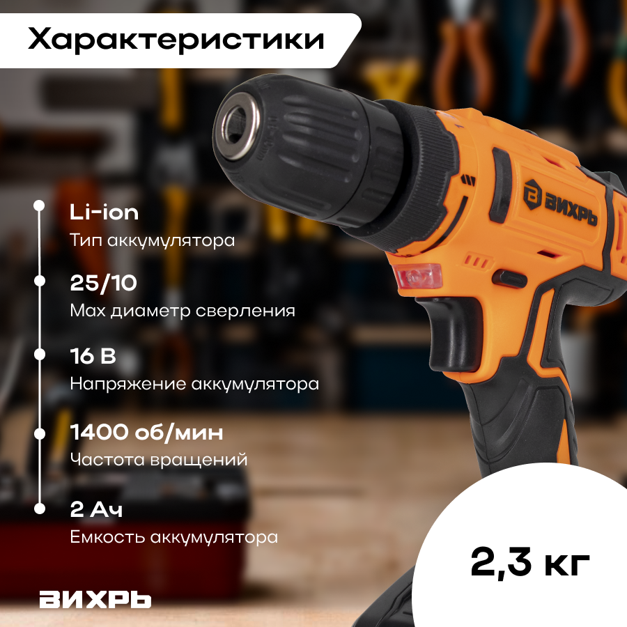Дрель-шуруповерт аккумуляторная Вихрь ДА-16Л-2К (2,0 А/ч) (72/14/32)
