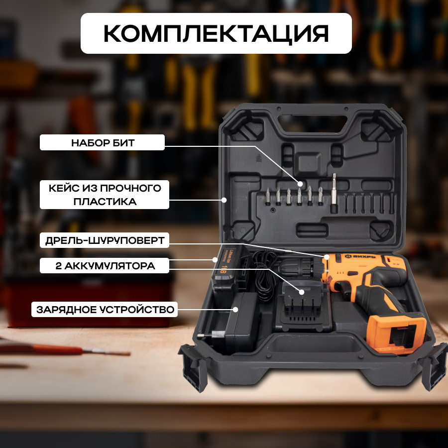 Дрель-шуруповерт аккумуляторная Вихрь ДА-16Л-2К, 16 В, 2 x 2 Ач, Li-Ion, ЗУ
