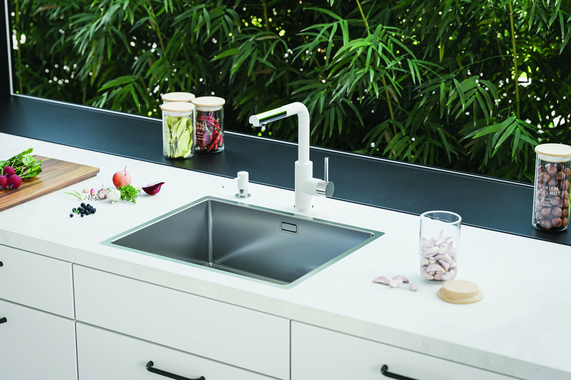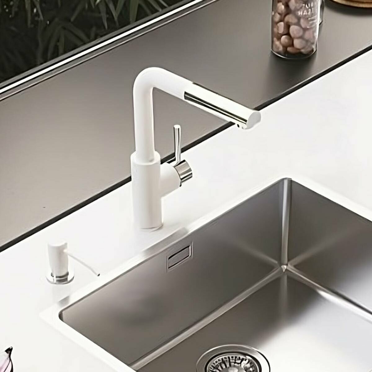 Смеситель для кухни с выдвижным высоким, поворотным изливом ALVEUS SIROS - P G11 ARCTIC белый матовый