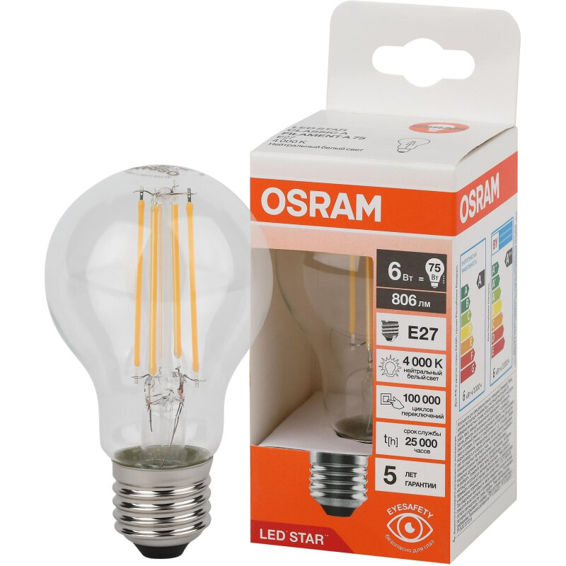 Лампочка светодиодная Osram филаментная стекло Груша A E27 6Вт 220В 4000К Дневной белый, упаковка 10шт