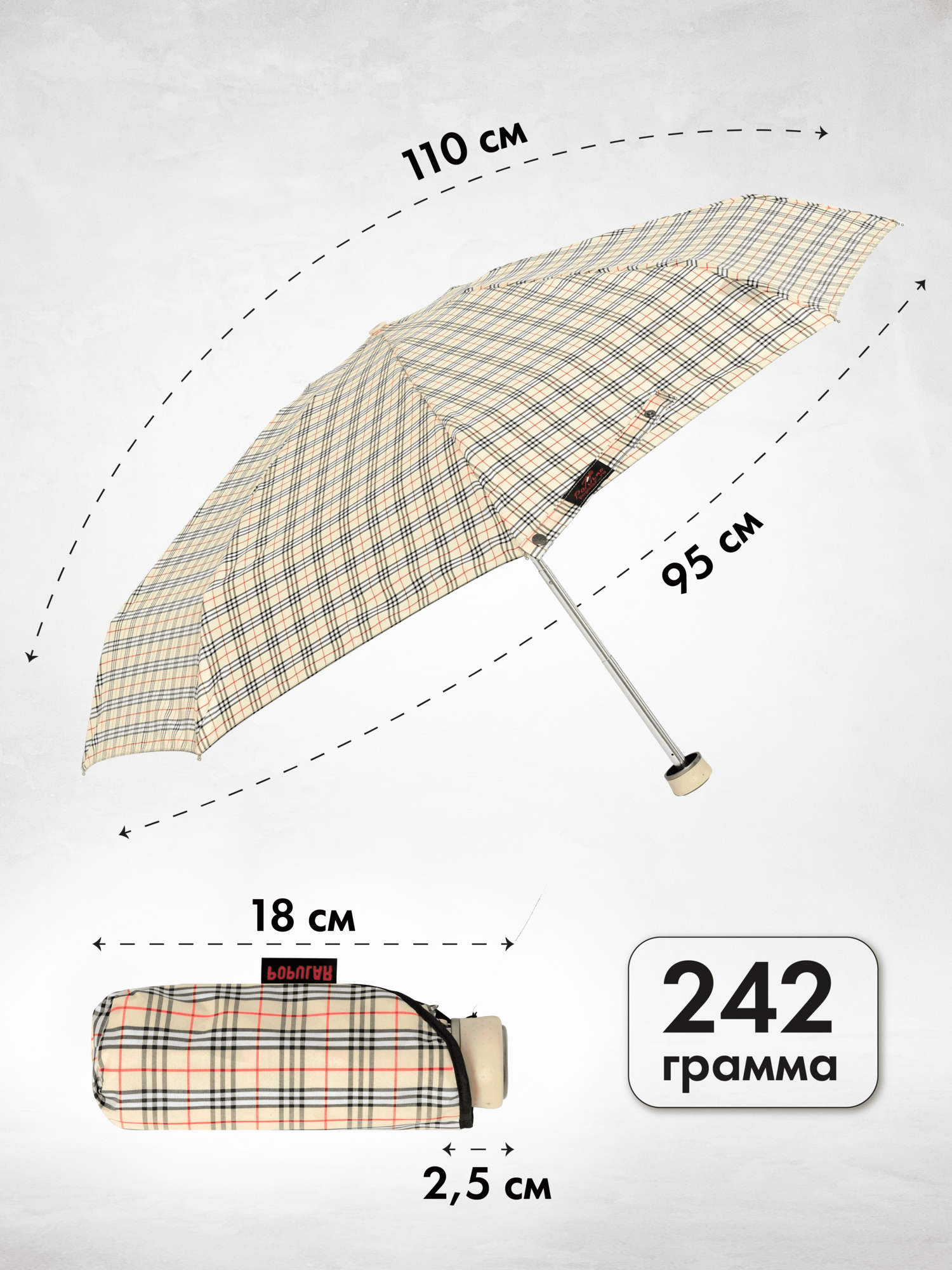 | Дополнительная информация | Комплектация: зонт 1шт, чехол 1шт, прозрачный пакет 1шт. |