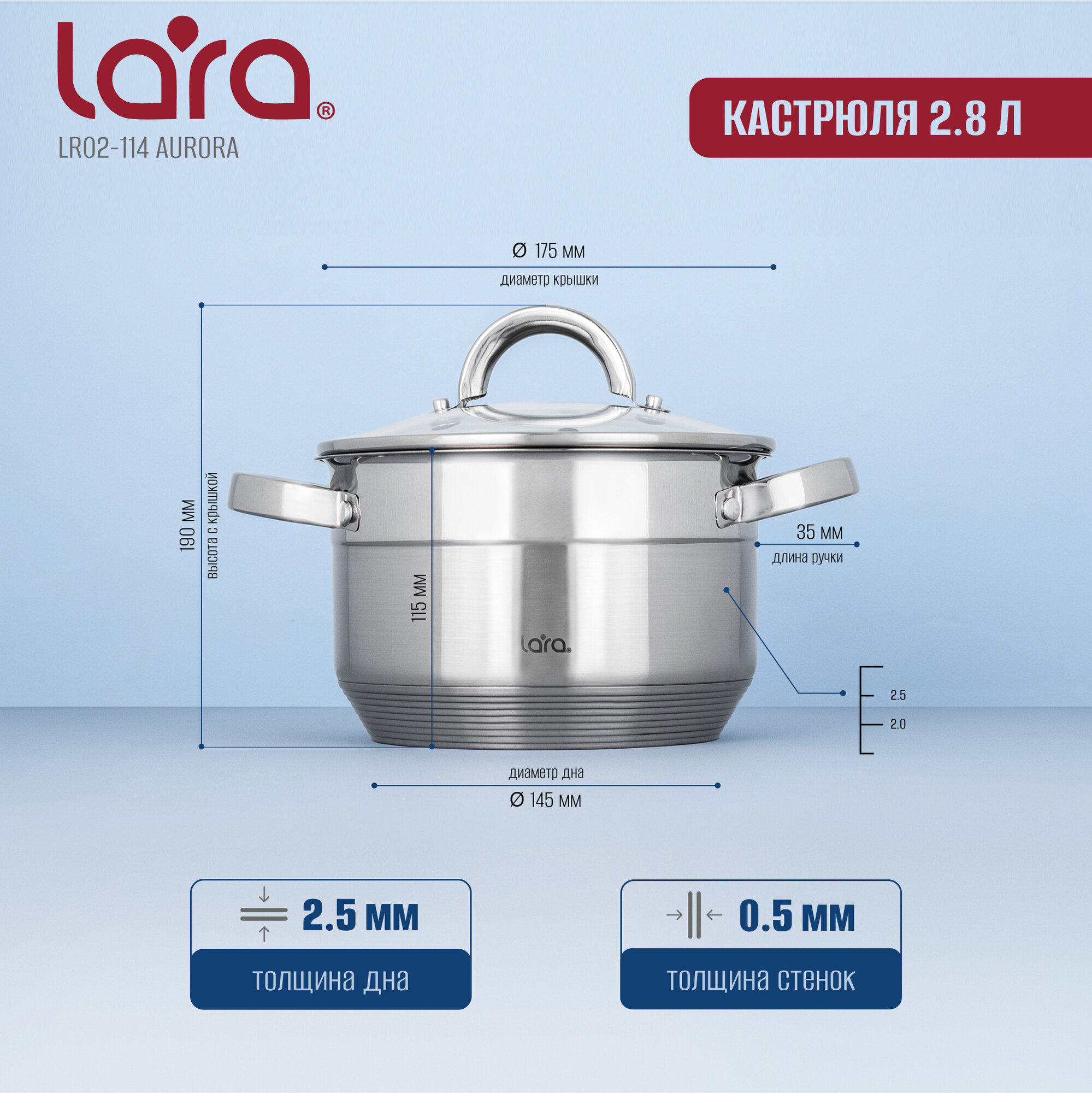 Набор кастрюль из нержавеющей стали LARA LR02-114 AURORA, 2.8 л + 4.8 л, для всех видов плит, 2 предмета