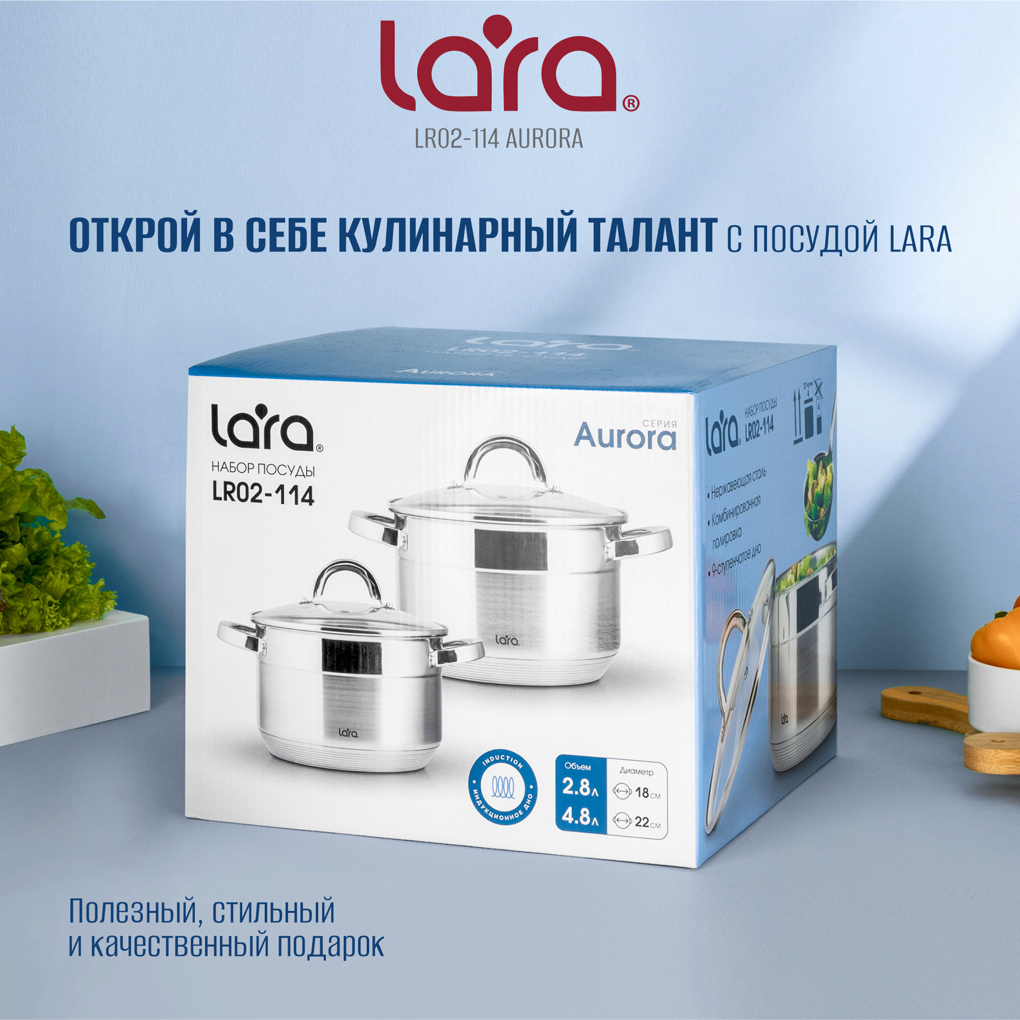 Набор посуды LARA LR02-114 AURORA, 2.8 л + 4.8 л, нержавеющая сталь, для всех видов плит, 2 предмета