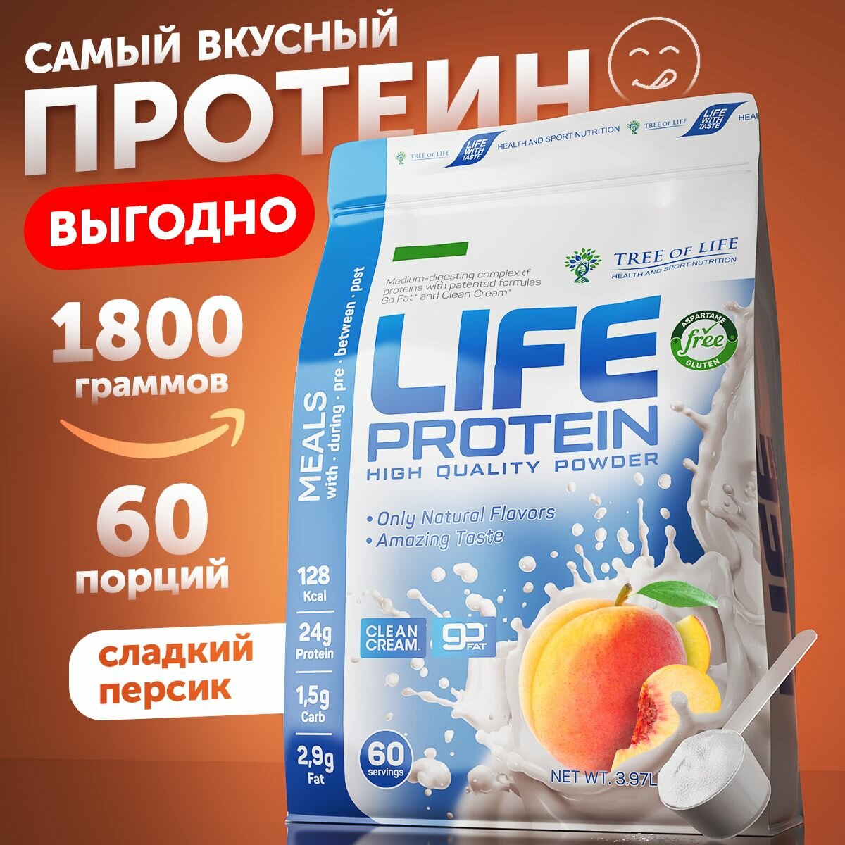 Протеин сывороточный + Изолят Life Protein 4LB. Мультикомпонентный белковый коктейль "Персик" здоровое питание для похудения и сушки, спортсменам женщинам 1800 гр, 60 порций