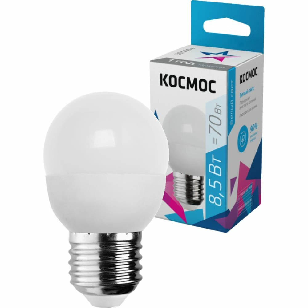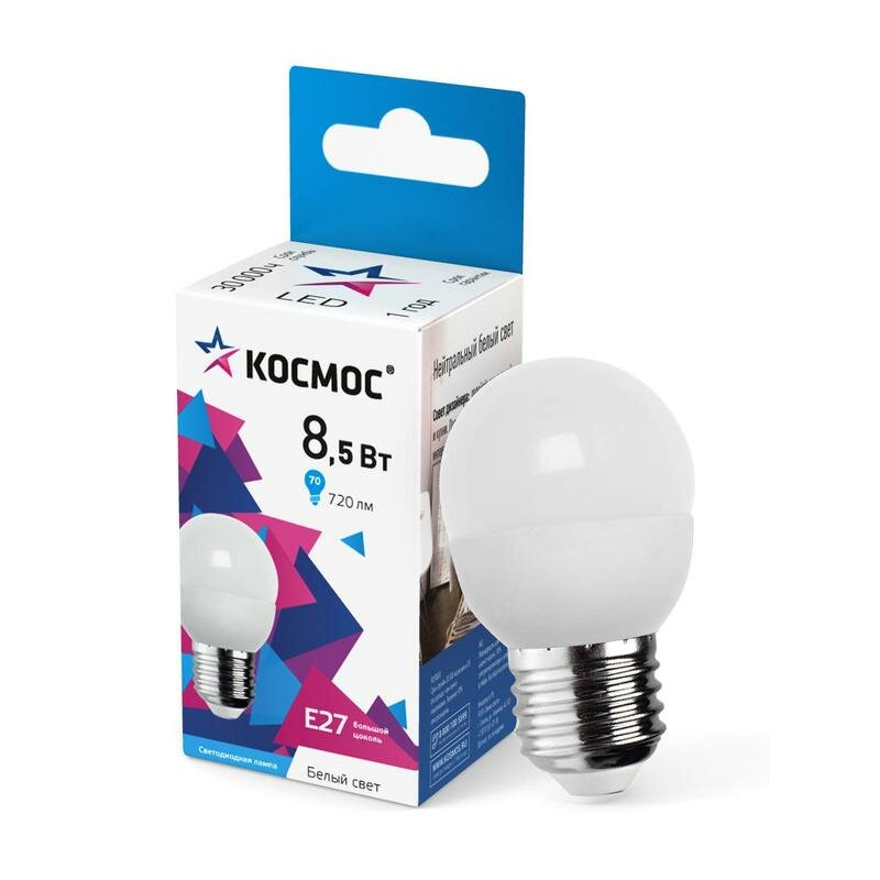 Светодиодная лампа Космос, 8.5 Вт, E27, 4500 K, шар, LED8.5wGL45E2745, нейтральный белый