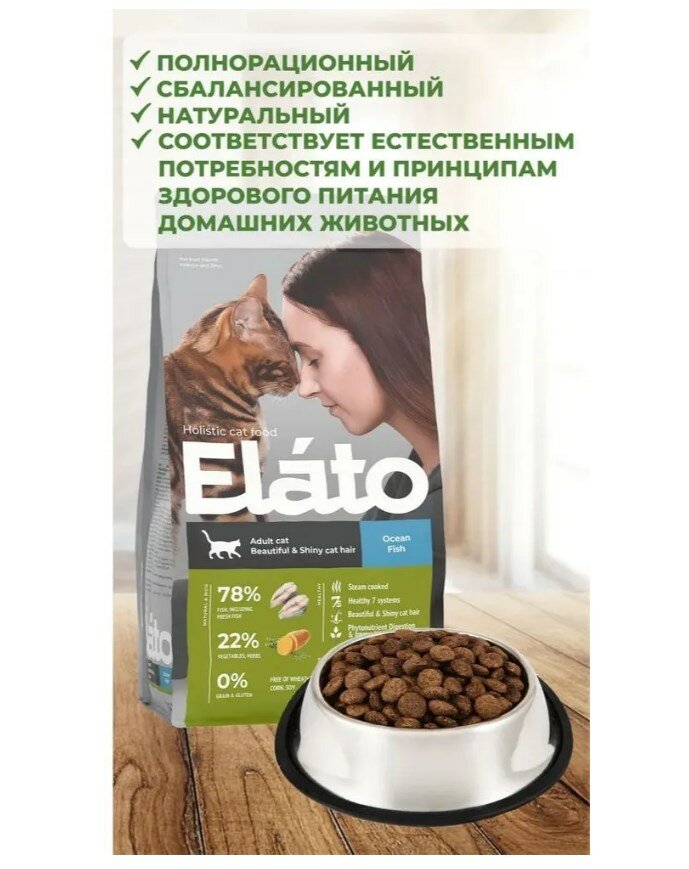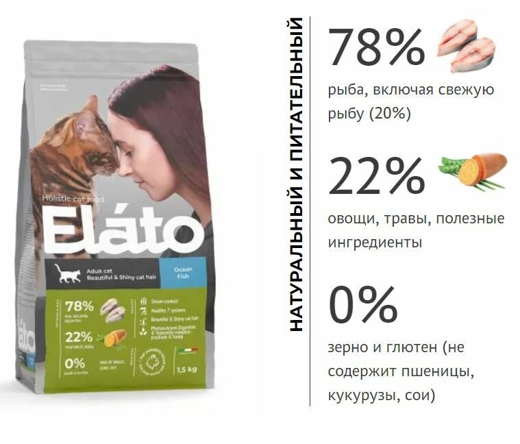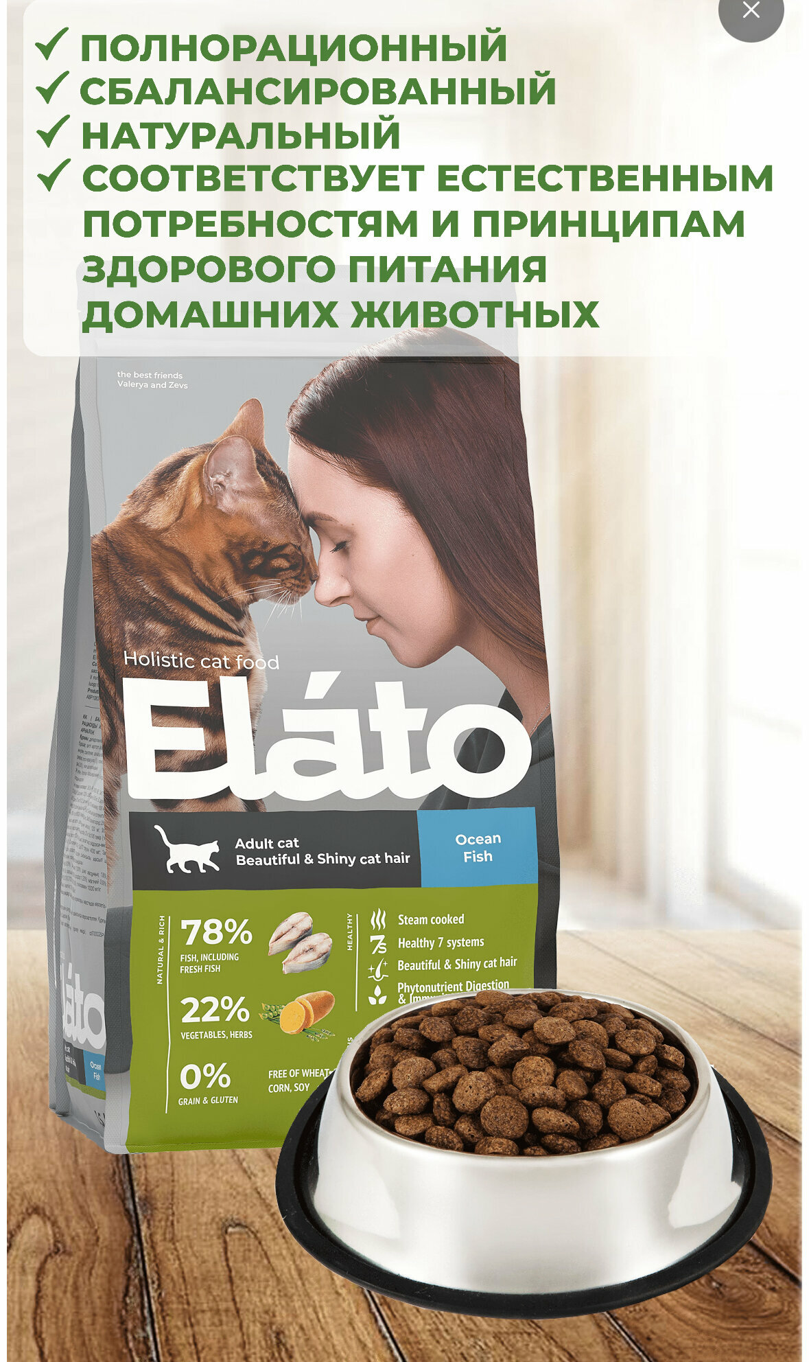 Купить Корм сухой Elato для взрослых кошек Holistic с рыбой для красивой и блестящей шерсти, полнорационный, 1,5 кг