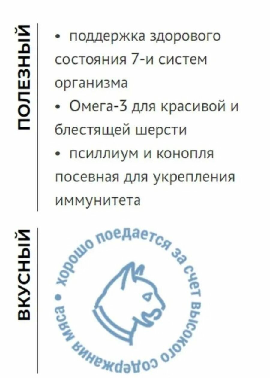 | Особые потребности | беззерновой / гипоаллергенный / для беременных / кормящих кошек / для вывода шерсти / для живущих в помещении / для живущих на улице / для здоровья кожи и блеска шерсти / для здоровья костей и суставов / для профилактики стресса / для стерилизованных/кастрированных / при чувствительном пищеварении / профилактика МКБ / профилактика зубного камня / профилактика избыточного веса |