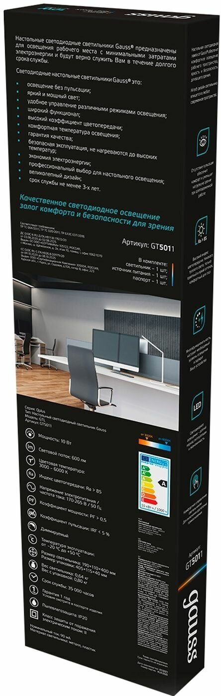 Лампа офисная светодиодная gauss GTL501, 10 Вт, черный