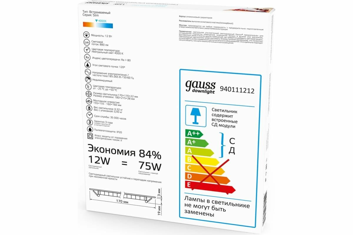 Светодиодный встраиваемый светильник Gauss 940111212 интересное: