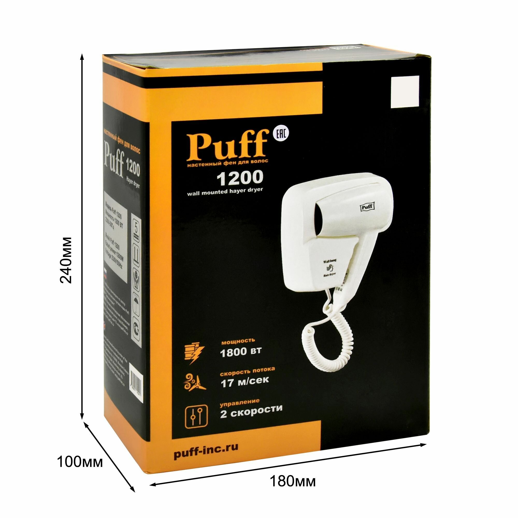 Фен Puff-1200, настенный, 1200 Вт, белый Puff 6879570 .