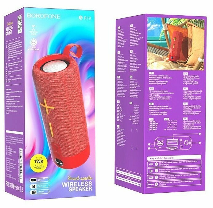 Портативная колонка BOROFONE BR19 Euphony, Bluetooth, пластик, FM, TF, SD, TWS, подсветка, красный (6974443381986)