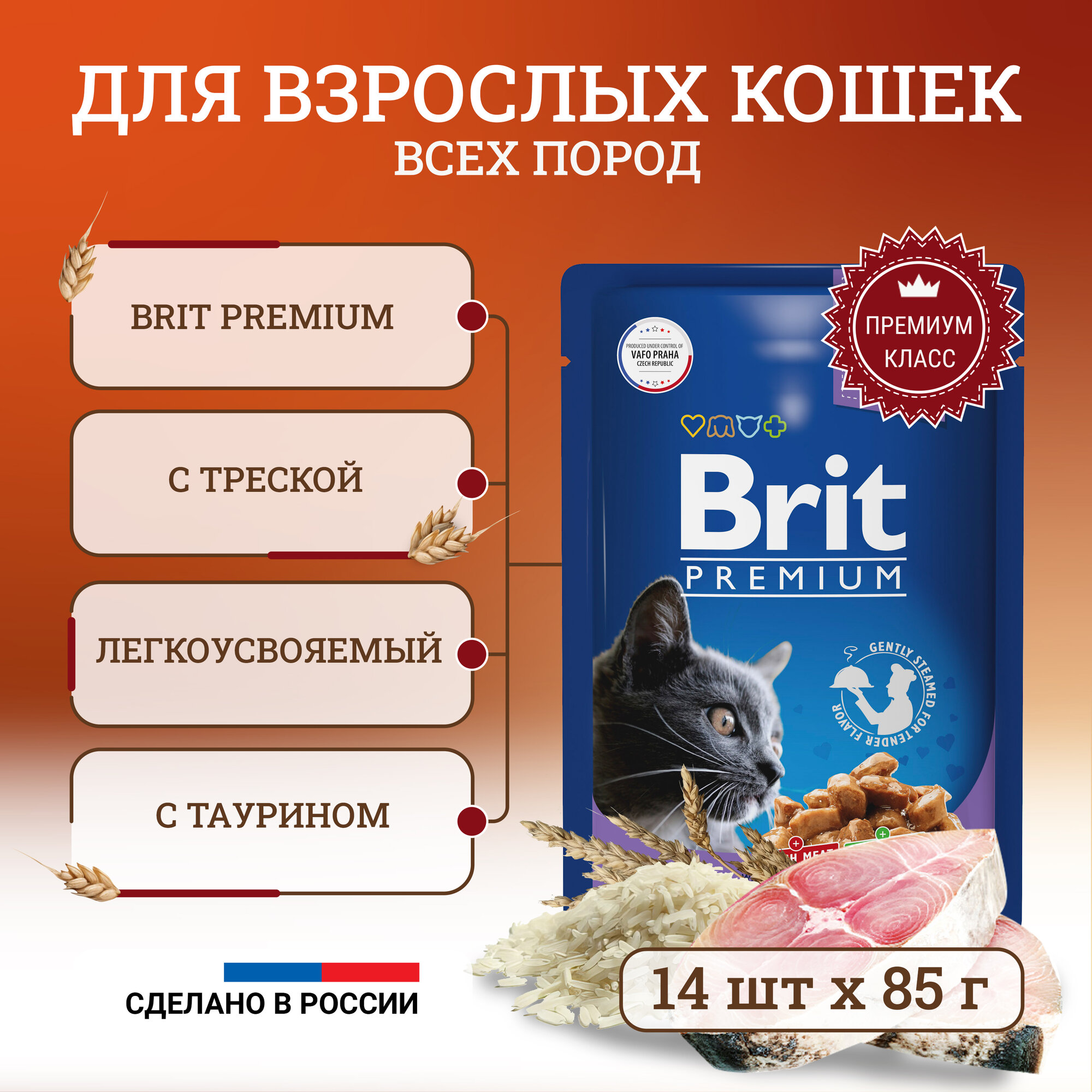 Корм для взрослых кошек BRIT Premium Треска в соусе 14шт.*85г