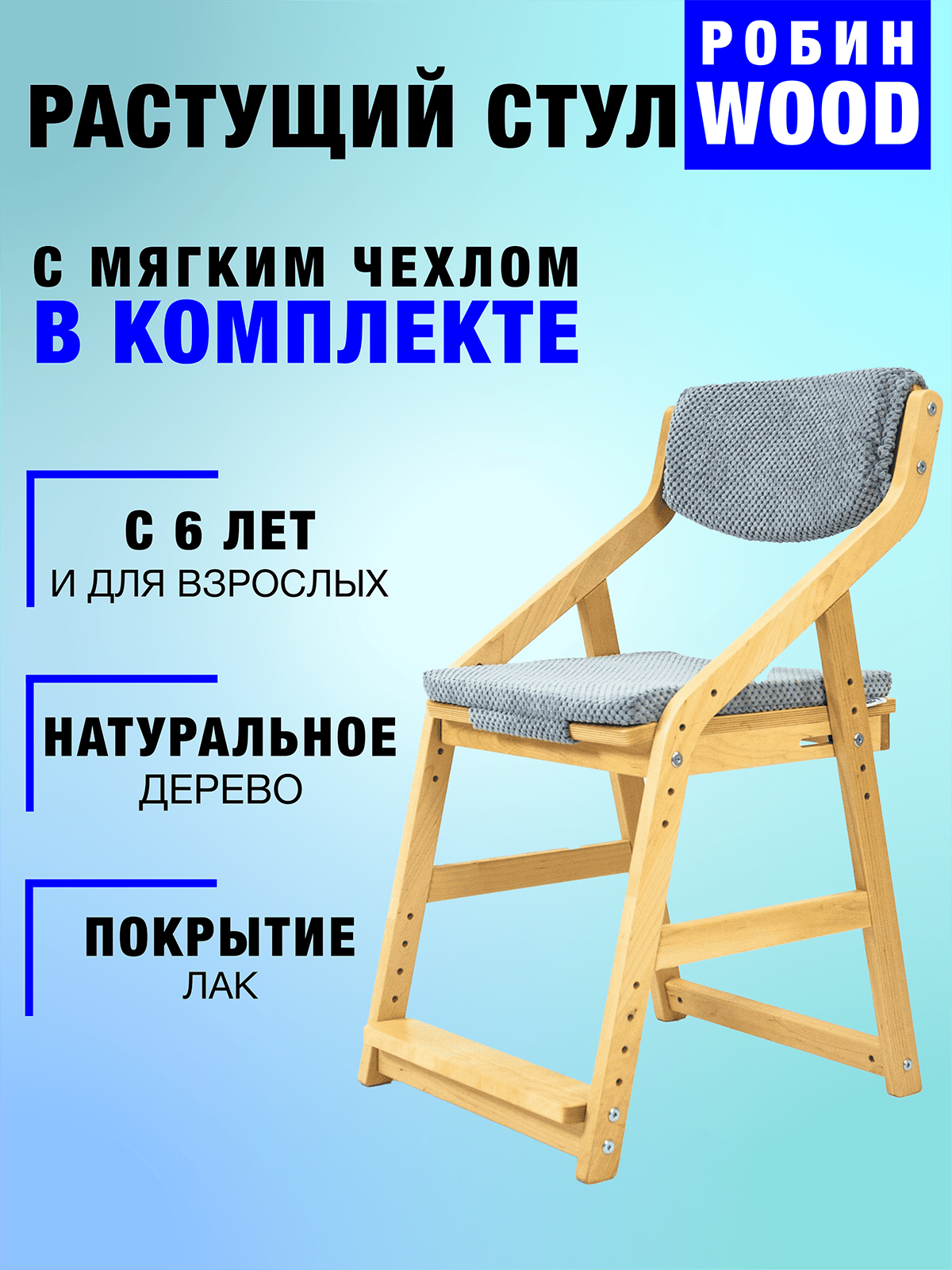 Стул детский регулируемый по высоте для школьника "Робин WOOD" натуральное дерево (ЛАК) с чехлом Лазурь