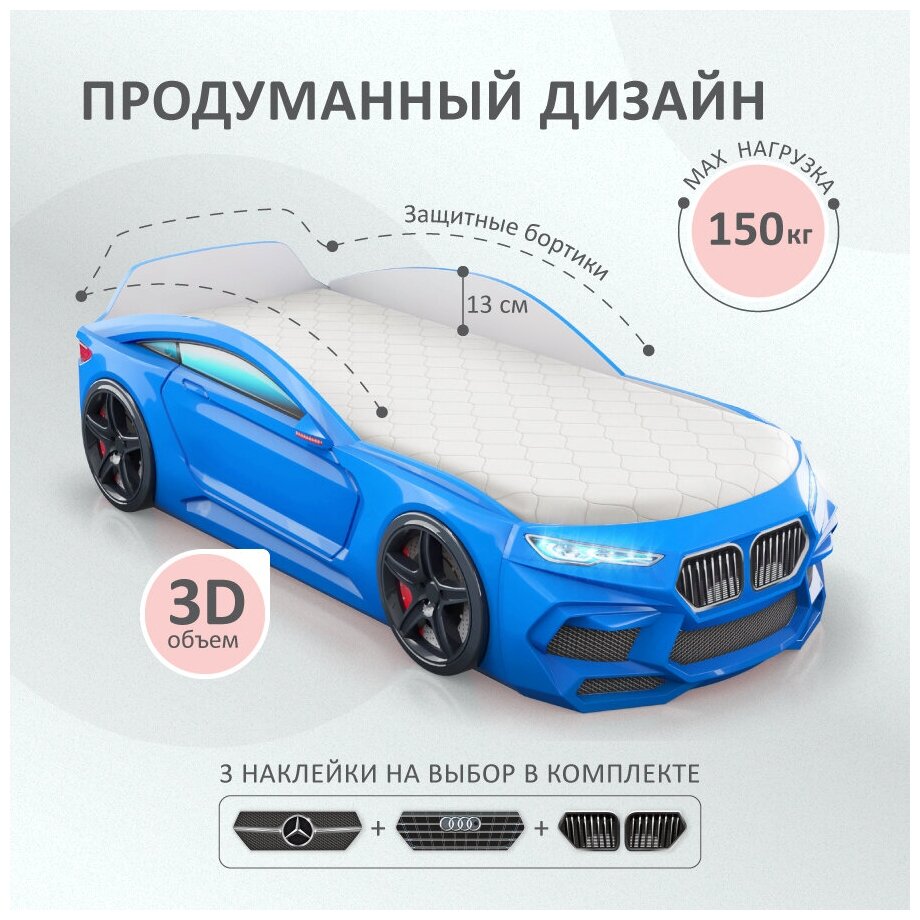 Кровать-машина "Romeo" объемная голубая с матрасом и подсветкой фар в комплекте, спальное место 170х70 см