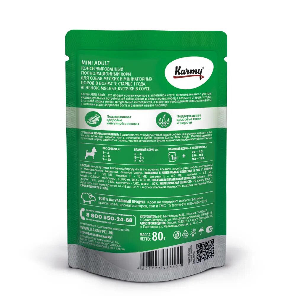 Влажный корм Karmy для собак мелких пород ягненок в соусе mini adult 80г 7928 интересное: