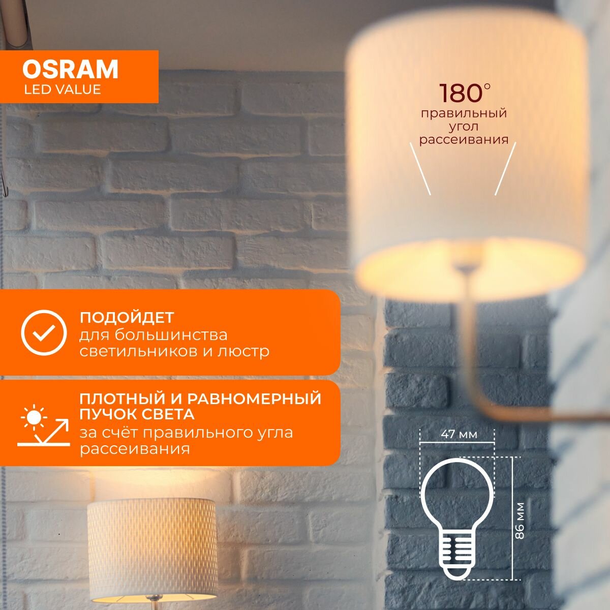 5шт/уп. Лампа LED Шарик 8Вт 220-240В E27 806Лм 3000К Угол 150 град. d 45mm h 90mm Свет Теплый белый Osram, уп. 5шт