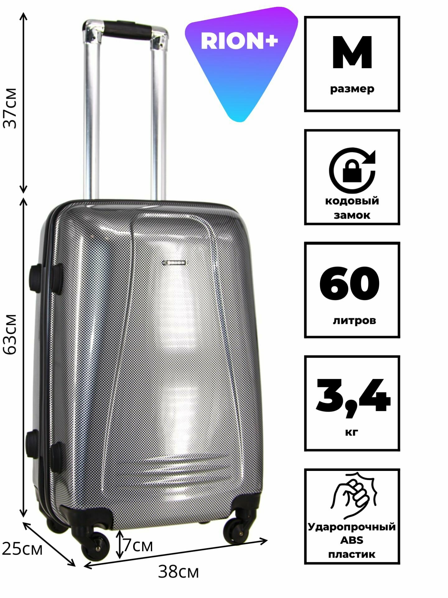 Чемодан Рион+ (RION+) R416, Пластик, 65 см, 60 литров, 4 колеса, M (56-70 см), усиленный толстый пластик, темно-серый