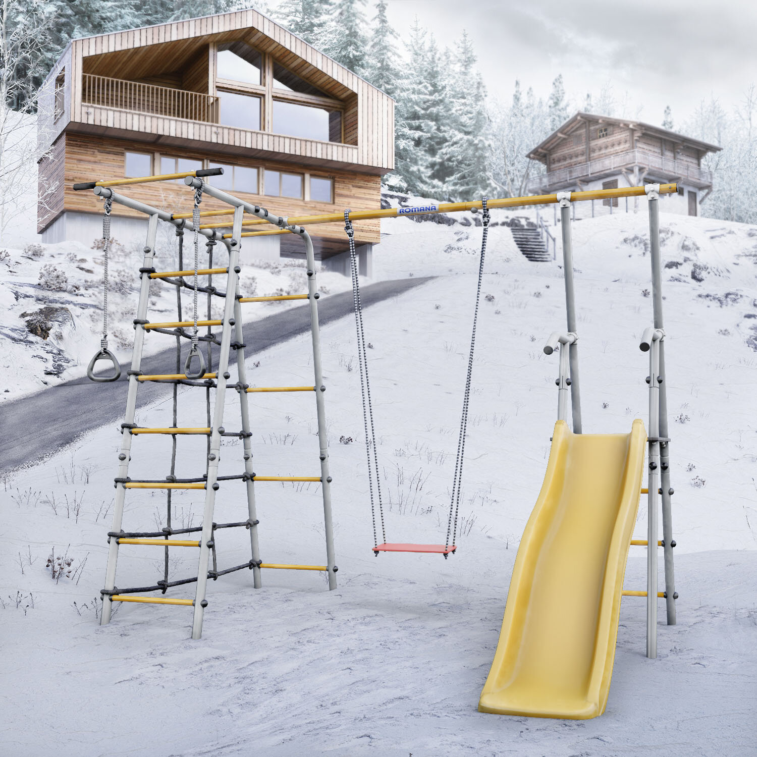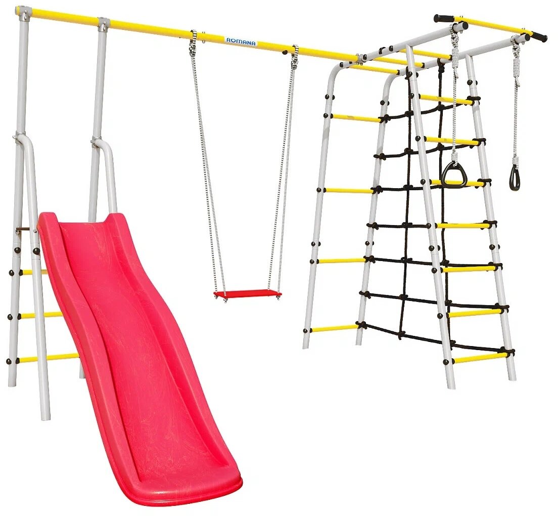 | Комплектация | лестница металлическая двойная П-образная с рукоходом, сетка для лазания, турник неподвижный, горка пластиковая, кольца гимнастические, качели |