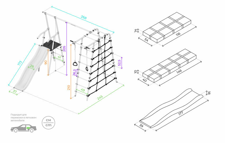 | В комплекте | гимнастические кольца, горка, качели, лестница, сетка для лазания, турник |