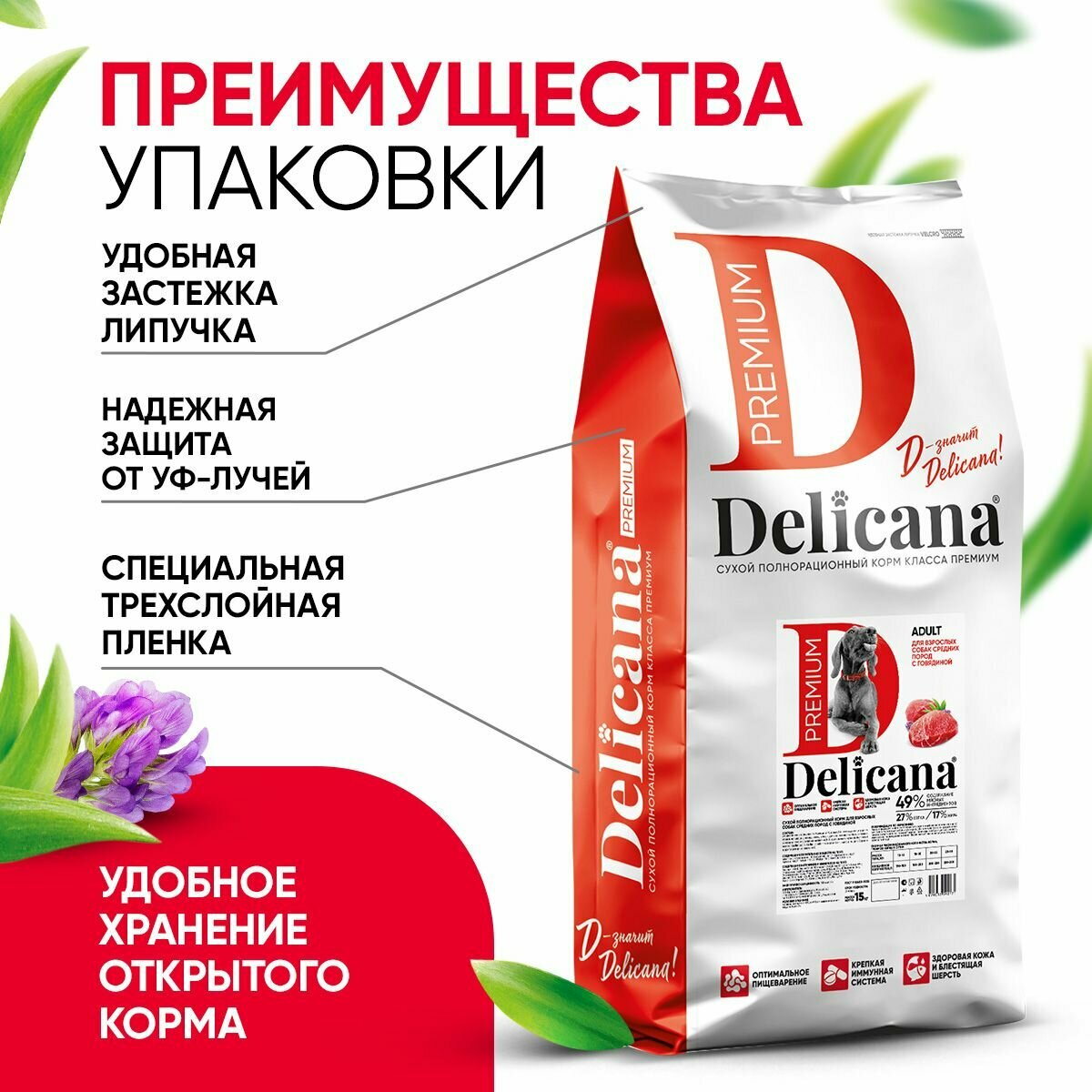 DELICANA Корм сухой для собак средних пород с говядиной, 15 кг