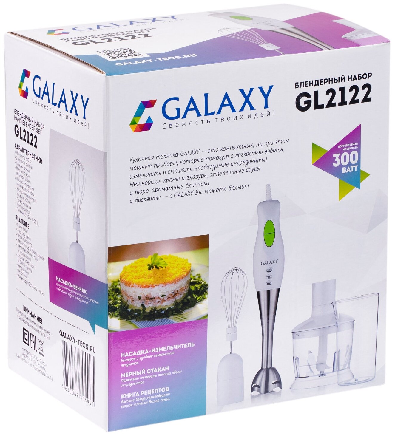 GALAXY LINE GL 2122 Блендерный набор мощность 300Вт, 2скорости работы, насадка венчик, мерный стакан объемом 500мл, насадка блендер из нержавеющей стали, насадка – измельчитель объемом 500мл, подвесная петля, книга рецептов, 220-240Вт 50Гц