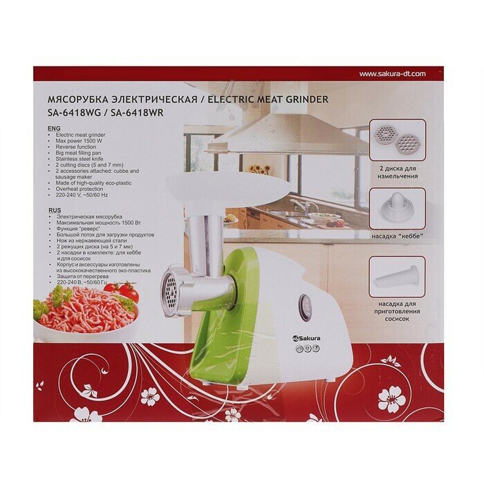 Мясорубка электрическая Sakura SA-6418WG, 1500 Вт, реверс, 2 насадки, 2 диска, зеленая