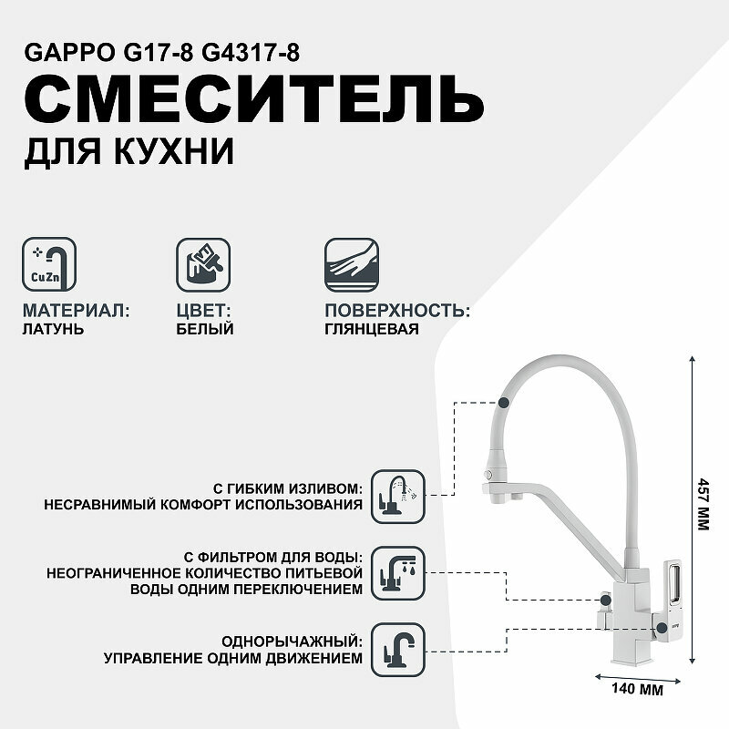 G4317-8 Cмеситель Кухня GAPPO d-35 c подключением фильтра питьевой воды (белый)