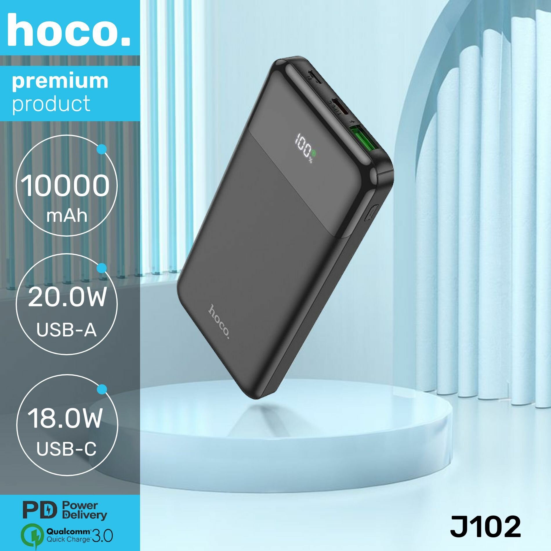 Внешний АКБ HOCO J102 Cool Figure 10000 mAh, 1xUSB, 1xUSB-C, 3А, QC 3.0, PD20W, LED, Li-Pol (черный)