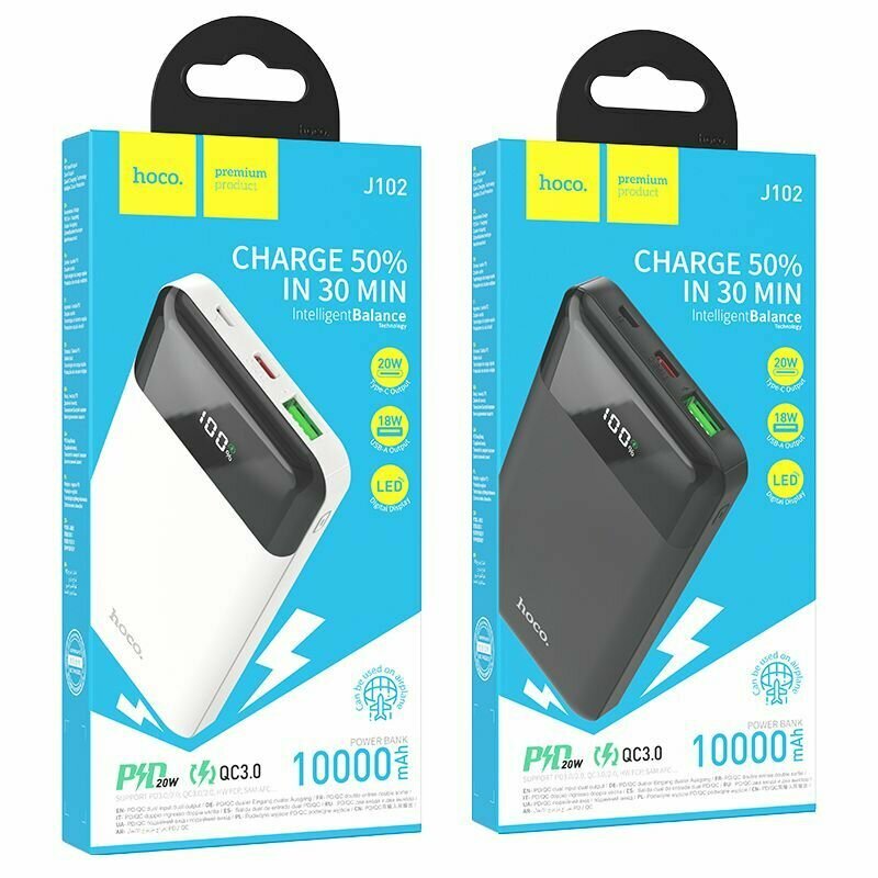 Универсальный Доп. Аккумулятор 10000mAh, J102, HOCO, выход: 1 USB (18W)+1 PD 20W, белый