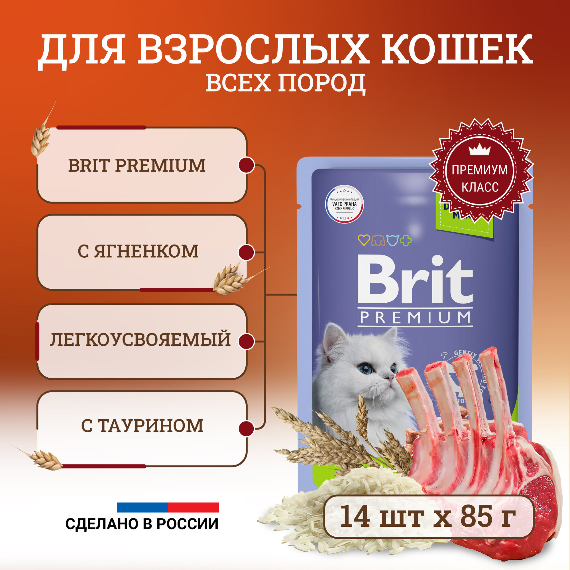 Корм для взрослых кошек BRIT Premium Ягненок в желе 14шт.*85г