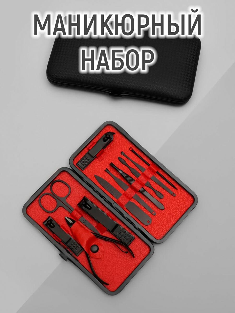 Набор маникюрный, 11 предметов, в футляре, в картонной коробке, цвет чёрный/красный интересное: