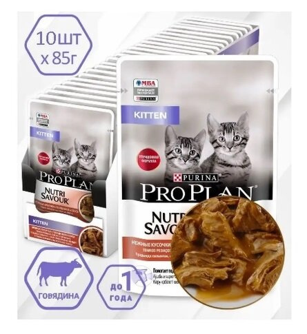 Купить Влажный корм Pro Plan Nutri Savour для котят, с говядиной в соусе, 85г, 10 шт