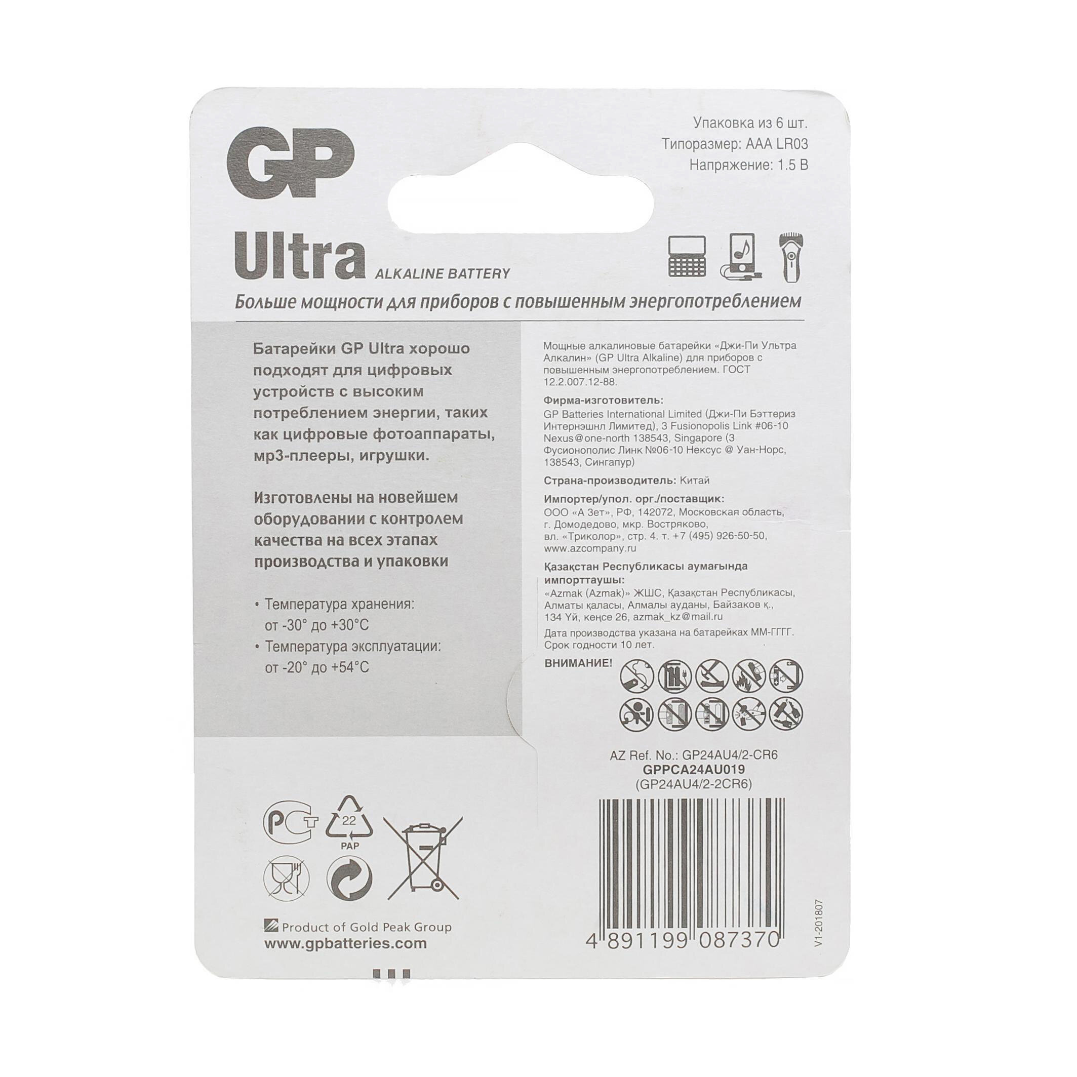 Батарейка GP AAA LR03 Ultra Alkaline BL6 GP24AU4/2-2CR6, 6шт.