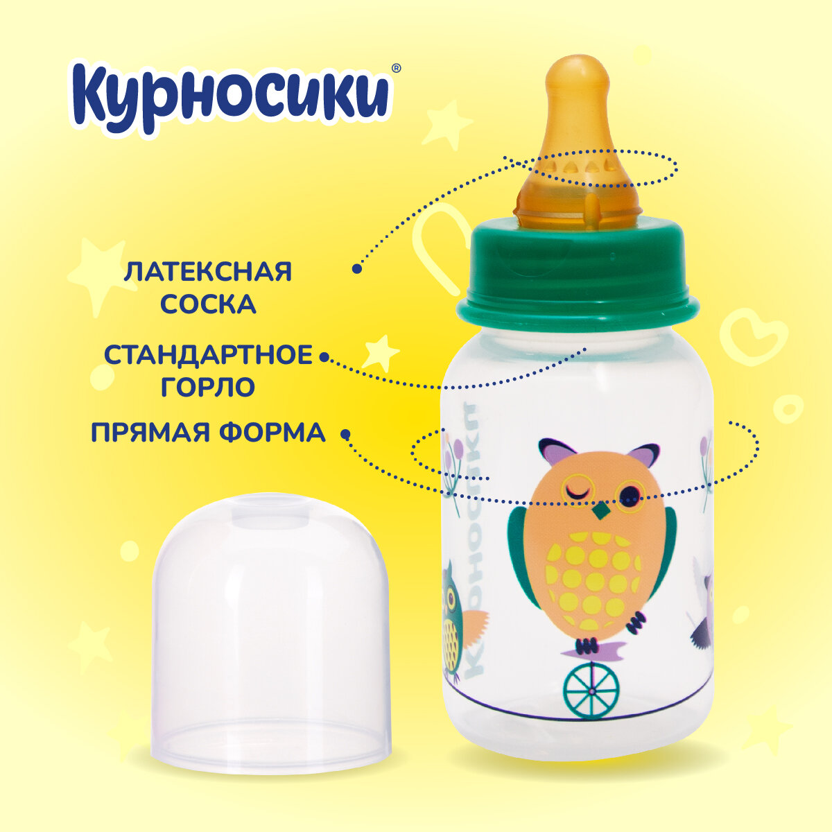Бутылочка для кормления новорожденного Курносики с латексной соской желтая "Совы", 0+ мес, 125 мл.