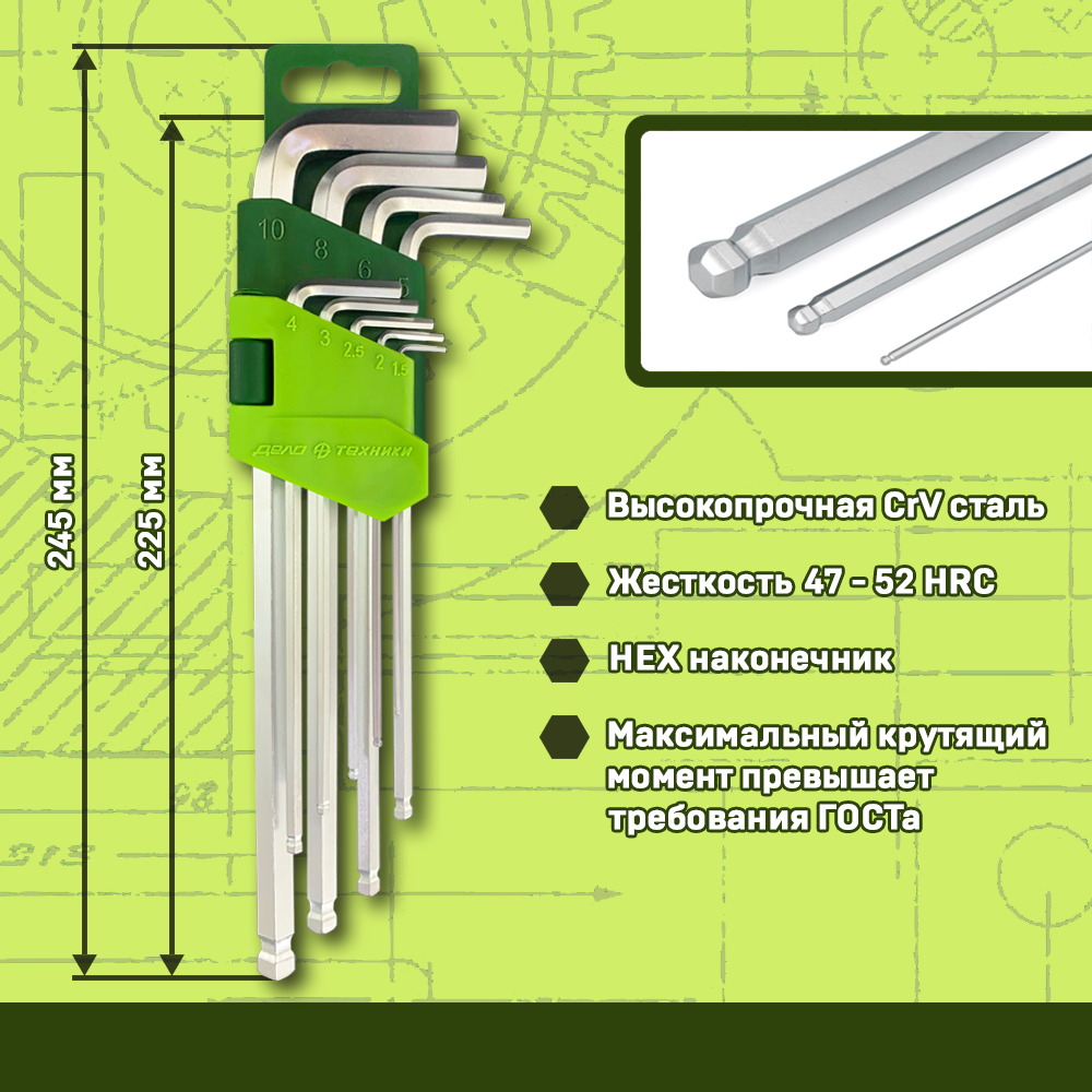 Набор Ключей Шестигранных С Шаром Удлиненных (1.5,2,2.5,3,4,5,6,8,10 Мм) 9 Шт. Дело Техники арт. 562092